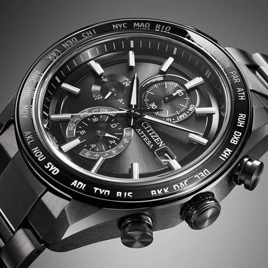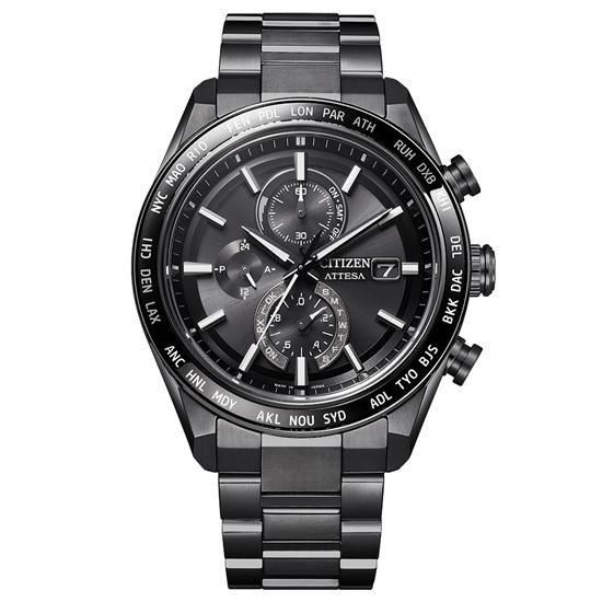 モノトーンでまとめたカラーリングで視認性を確保しました。ベゼルはGPS搭載モデルで人気のサファイアガラスリングを搭載した高級仕様で、サファイアベゼルの上にシルバー蒸着で仕上げた都市名表示が輝きます。