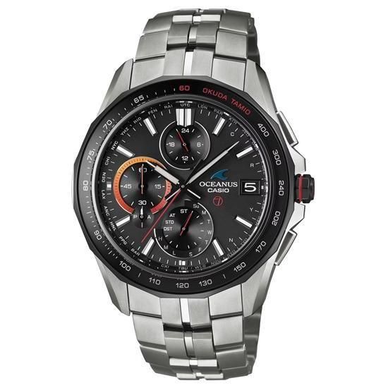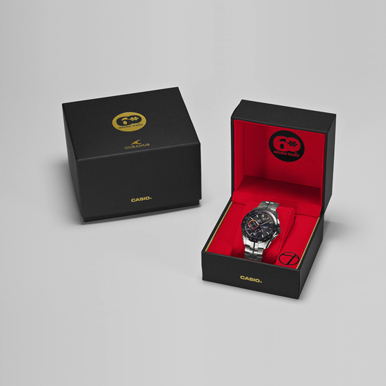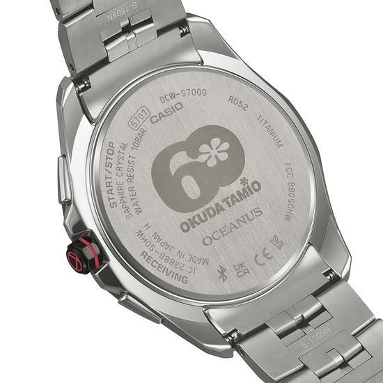 サファイアガラスベゼルのタキメーターには「OKUDA TAMIO」の文字と生誕60周年を祝い「60」の文字を赤色にした特別仕様。9時側のインダイアルリングは、自身の好きな色であるオレンジと赤のグラデーションデザインを採用しています。